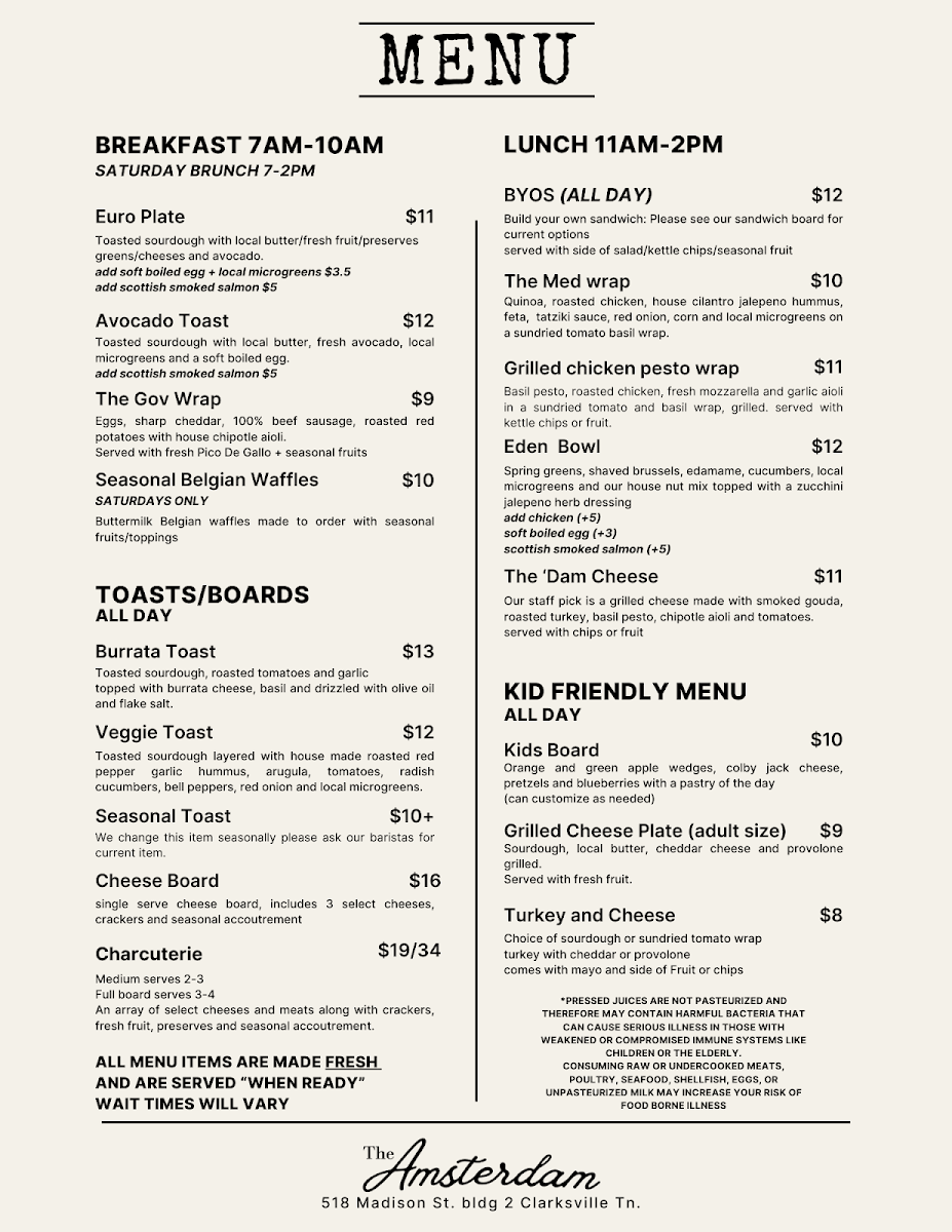 Welcome to The Amsterdam Local, a charming café nestled in Clarksville, TN, that offers a delightful escape to the heart of the Netherlands. The menu features an array of European-inspired plates that tantalize the taste buds, from classic grilled cheese and turkey sandwiches on the kid-friendly menu to impressive shareable options like the expansive charcuterie board and cheese board.